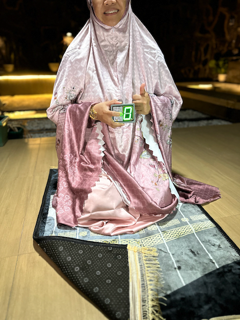 Mata saya sudah tidak begitu terlihat tulisan kecil. Namun penghitung rakaat di sajadah ini kelihatan jelas